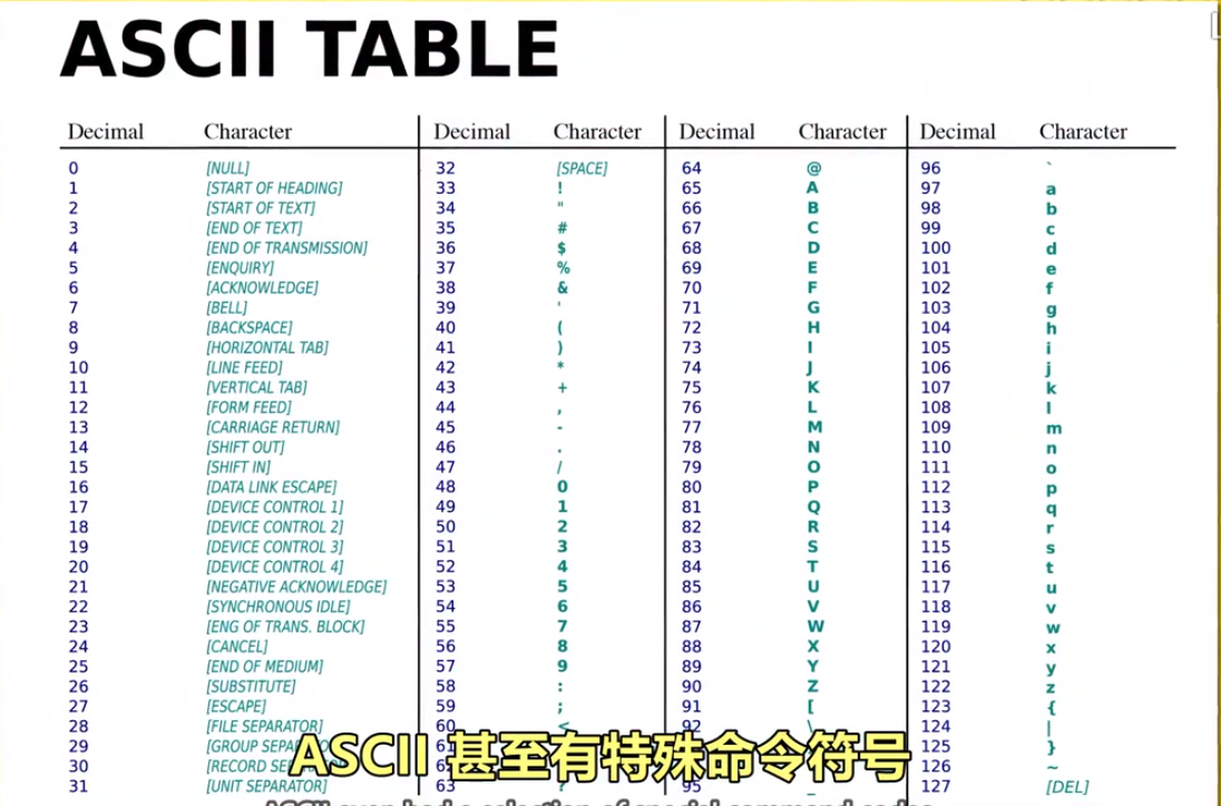 - 美国信息交换标准代码 - ASCII, 用来表示字符