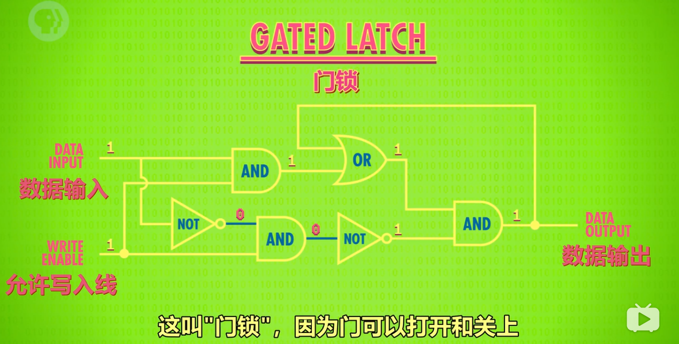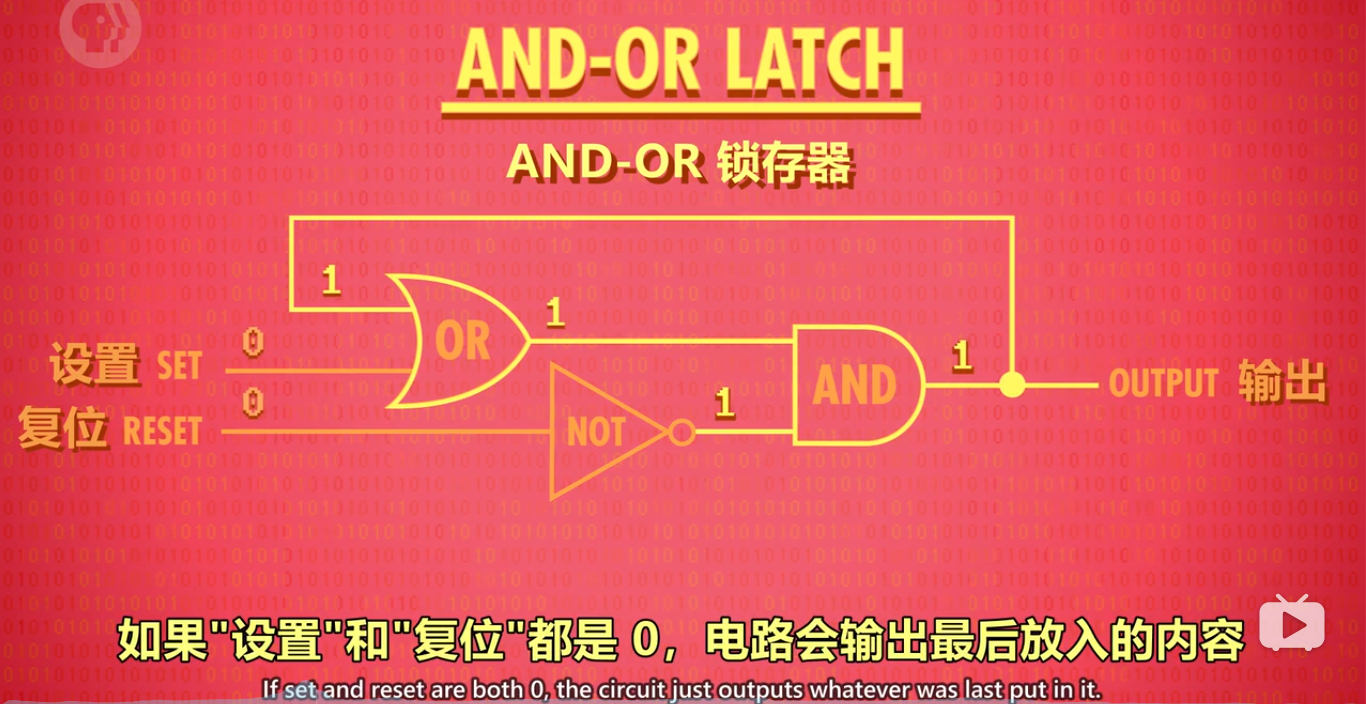 - 它有两个输入,”设置”输入, 把输出变成 1,”复位”输入, 把输出变成 0 ,如果”设置”和”复位”都是 0,电路会输出最后放入的内容