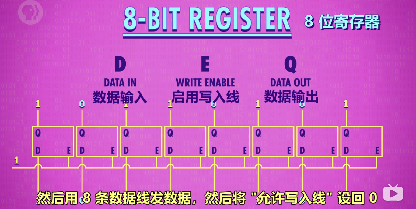 - 如果我们并排放 8 个锁存器,可以存 8 位信息,比如一个 8 bit 数字,一组这样的锁存器叫 “寄存器”,寄存器能存一个数字,这个数字有多少位,叫”位宽”,如今许多计算机都有 64 位宽的寄存器