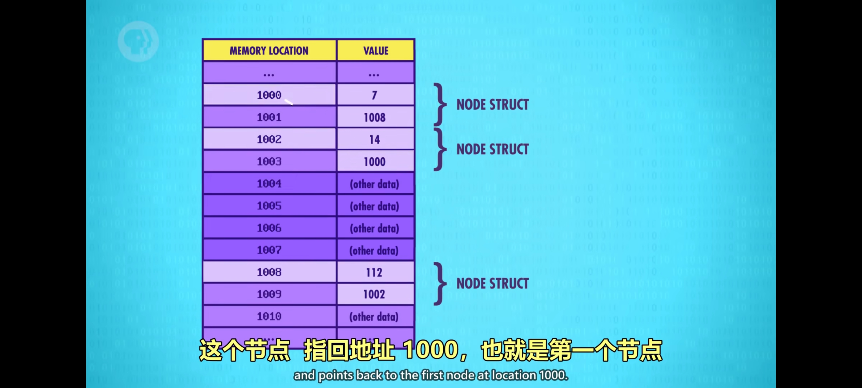 1008,代表下一个节点,位于内存地址1008,下一个节点值是 112,指向地址1002是一个值为 14 的节点。这个节点指回地址1000,也就是第一个节点。这叫循环链表,但链表也可以是非循环的,最后一个指针是 0,”null“,代表链表尽头。