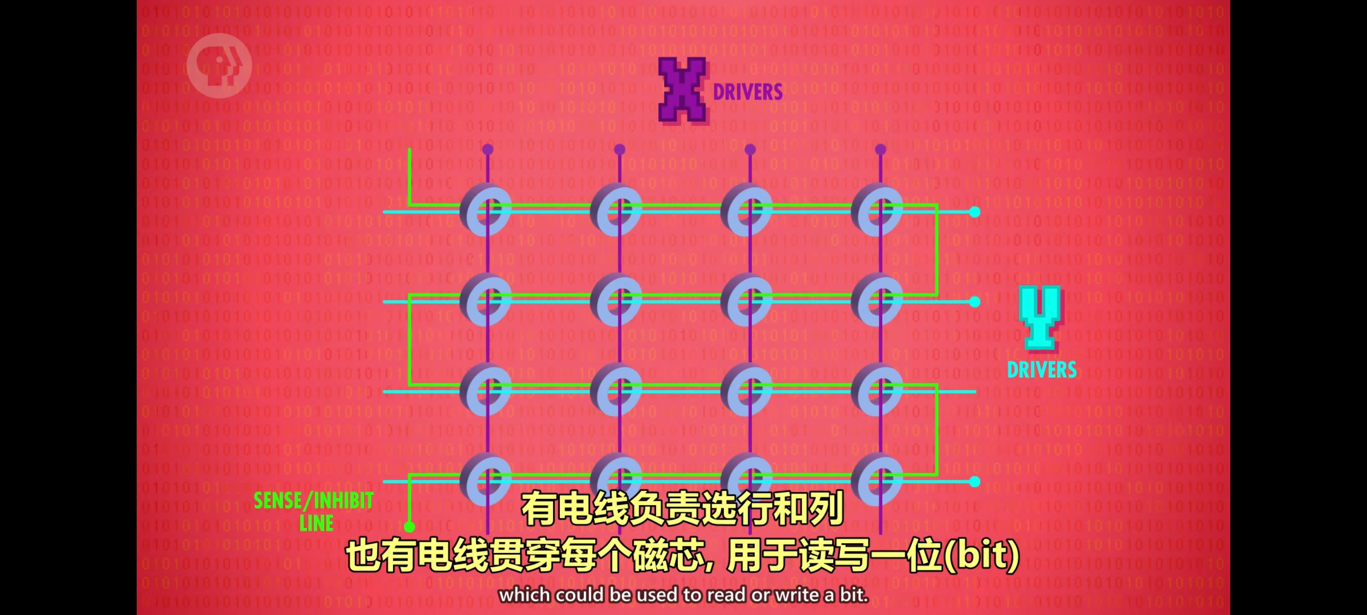 “磁芯存储器“,用了像甜甜圈的小型磁圈如果给磁芯绕上电线,并施加电流,可以将磁化在一个方向如果关掉电流,磁芯保持磁化如果沿相反方向施加电流磁化的方向(极性)会翻转这样就可以存 1 和 0 !如果只存 1 位不够有用,所以把小甜甜圈排列成网格有电线负责选行和列,也有电线贯穿每个磁芯, 用于读写一位(bit)更重要的是,不像”延迟线存储器”磁芯存储器能随时访问任何一位(bit)”。磁芯存储器” 从 1950 年代中期开始成为主流,流行了 20 多年而且一般还是手工编织的!