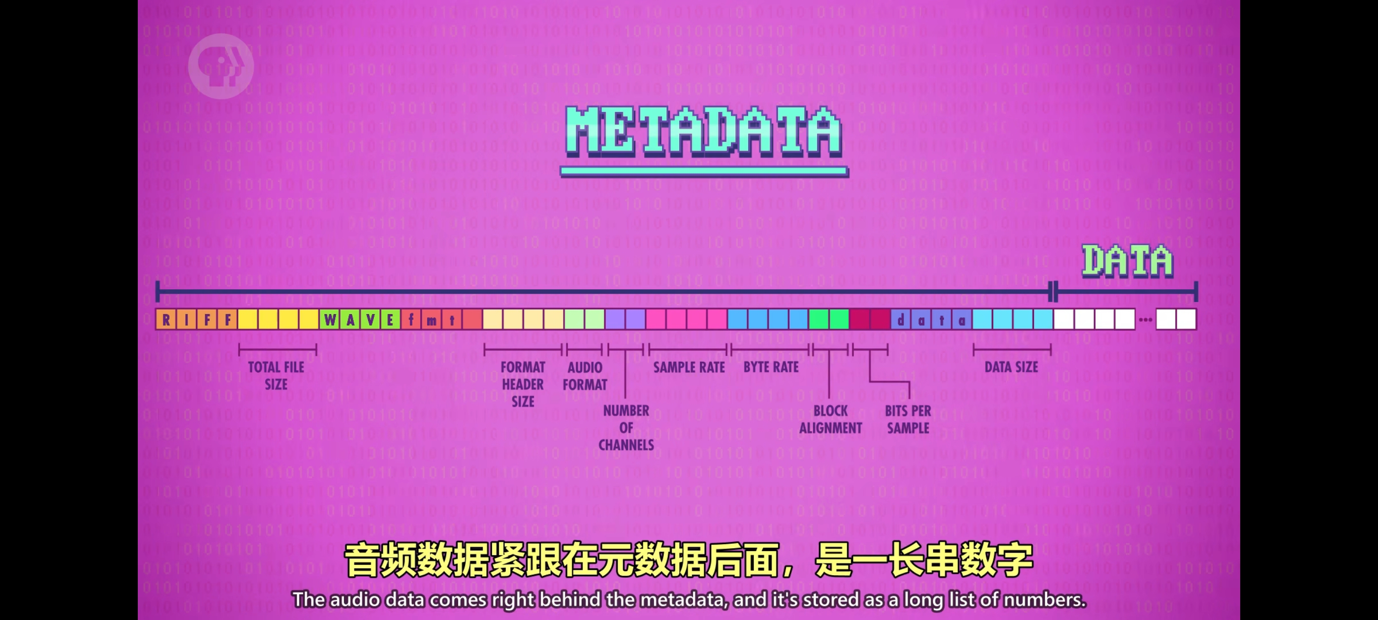 - 波形(Wave)文件,也叫 WAV 它存音频数据,在正确读取数据前,需要知道一些信息,比如码率(bit rate),以及是单声道还是立体声,关于数据的数据,叫”元数据“(meta data)。元数据存在文件开头,在实际数据前面,因此也叫 文件头(Header)。WAV 文件的前 44 个字节长这样