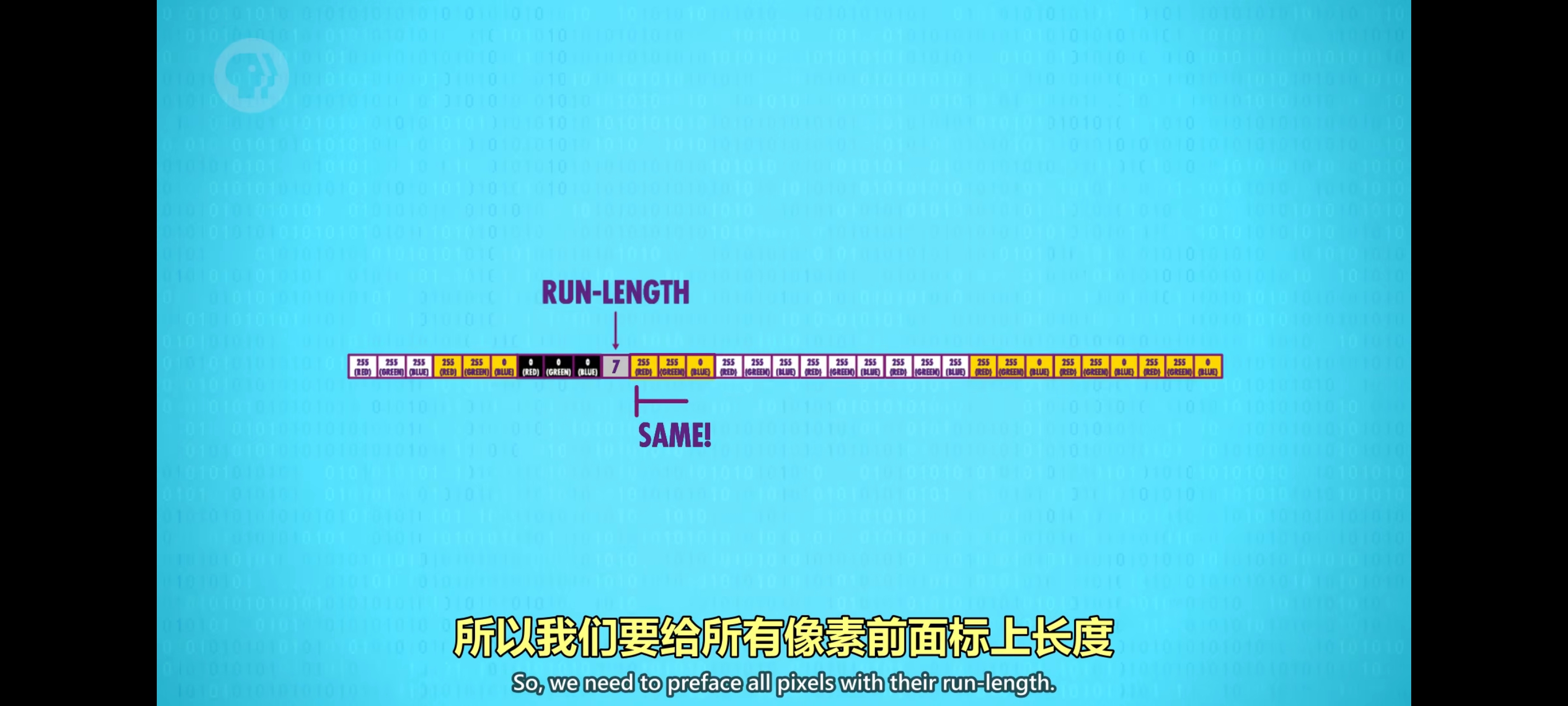一种方法是减少重复信息,最简单的方法叫游程编码(Run-Length Encoding)适合经常出现相同值的文件,比如吃豆人有7个连续黄色像素与其全存下来可以插入一个额外字节,代表有7个连续黄色像素然后删掉后面的重复数据。为了让计算机能分辨哪些字节是”长度” 哪些字节是”颜色”,格式要一致所以我们要给所有像素前面标上长度,有时候数据反而会变多。但是没有损失任何数据,我们可以轻易恢复到原来的数据。解压缩后,数据和压缩前完全一样,这叫”无损压缩“,没有丢失任何数据。