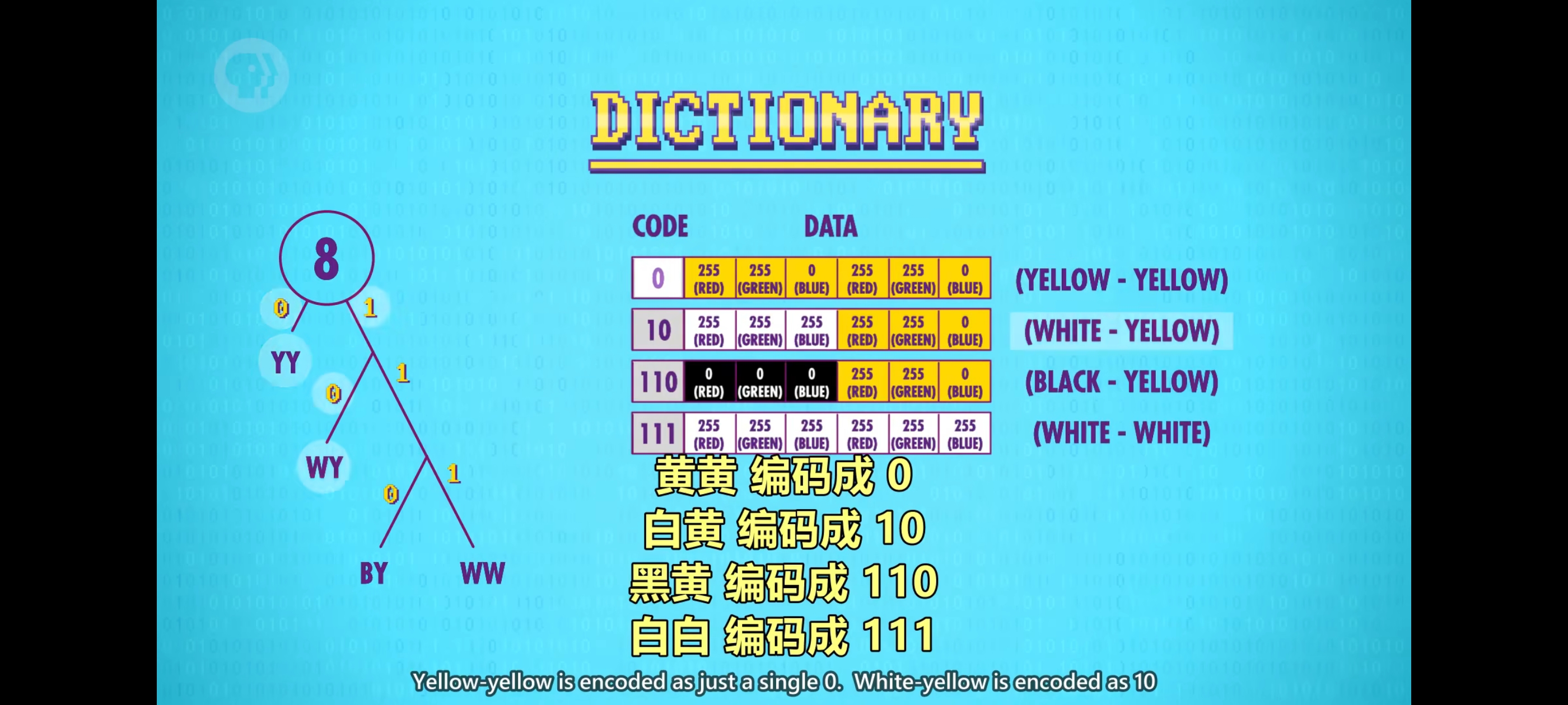 另一种无损压缩“字典编码”,它用更紧凑的方式表示数据块,我们使用一个字典,存储”代码”和”数据”间的对应关系。个字典,存储”代码”和”数据”间的对应关系。我们可以把图像看成一块块,而不是一个个像素。例如,把2个像素当成1块,为四对:白黄 黑黄 黄黄 白白,生成紧凑代码(compact codes)根据频率生成 “霍夫曼树“(Huffman Tree)来生成每组对应一个唯一编码的字典。