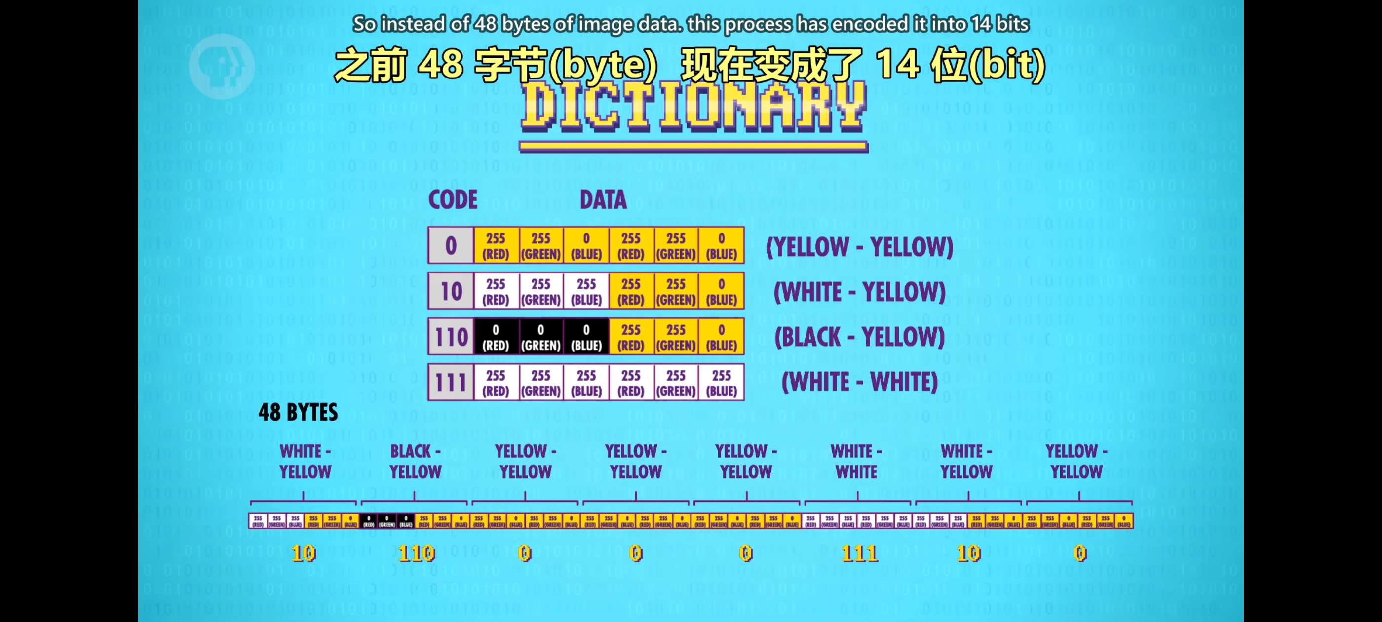 字典也要保存下来,否则这 14 bit的编码毫无意义。现在加上字典,图像是 30 个字节(bytes)。