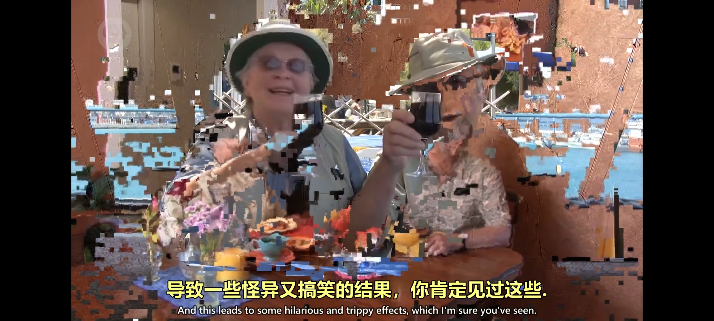 MPEG-4 是常见标准,可以比原文件小20倍到200倍,但用补丁的移动和旋转来更新画面,当压缩太严重时会出错,没有足够空间更新补丁内的像素。即使补丁是错的,视频播放器也会照样播放,导致一些怪异又搞笑的结果。
