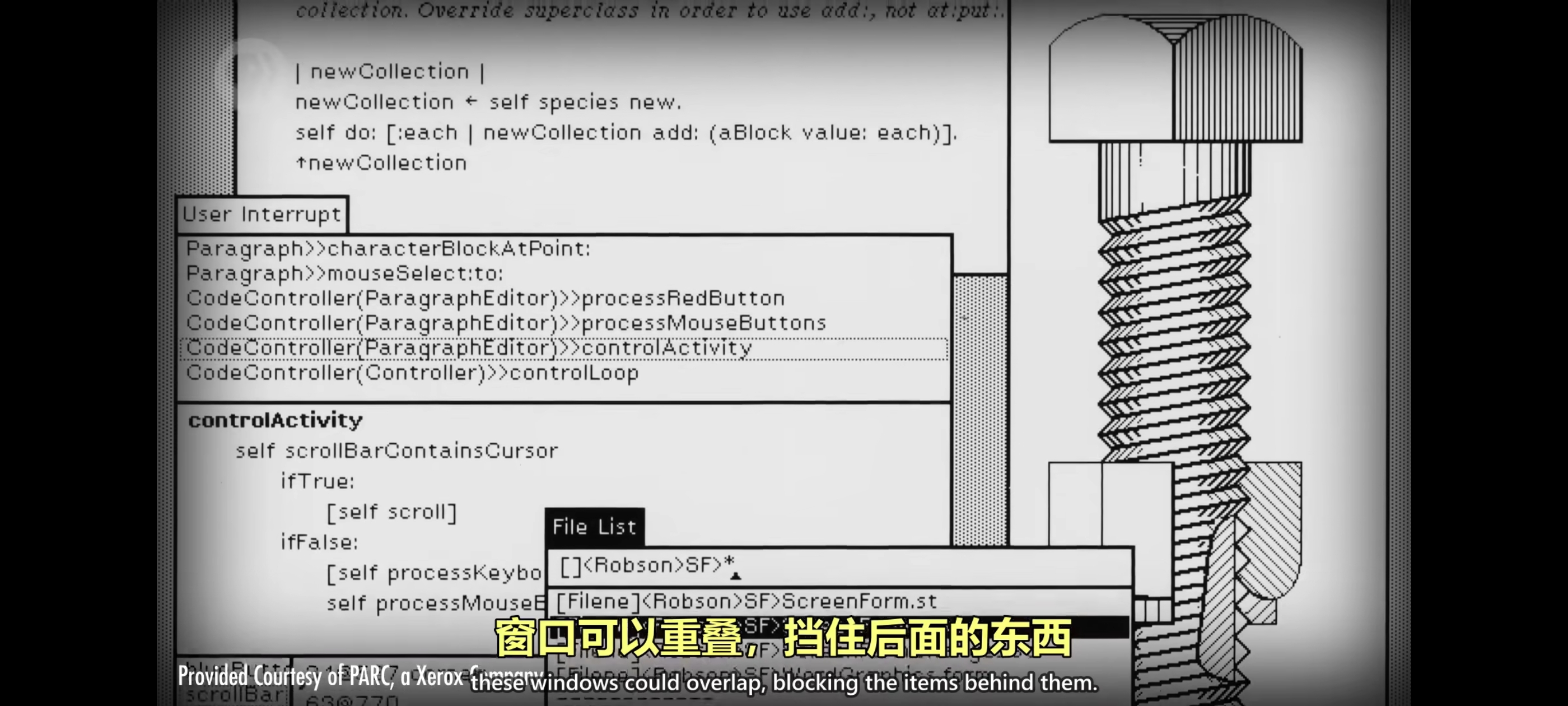 就像桌上的文件一样,窗口可以重叠,挡住后面的东西,还有桌面配件,比如计算器和时钟。用户可以把配件在屏幕上四处移动,它不是现实桌面的完美复制,而是用桌面这种隐喻,因此叫”桌面隐喻“。有很多方法来设计界面但 Alto 团队用窗口,图标,菜单和指针来做,因此叫 WIMP 界面。如今大部分图形界面都用这个,它还提供了一套基本部件,可复用的基本元素比如按钮,打勾框,滑动条和标签页,GUI 程序就是这些小组件组成的。