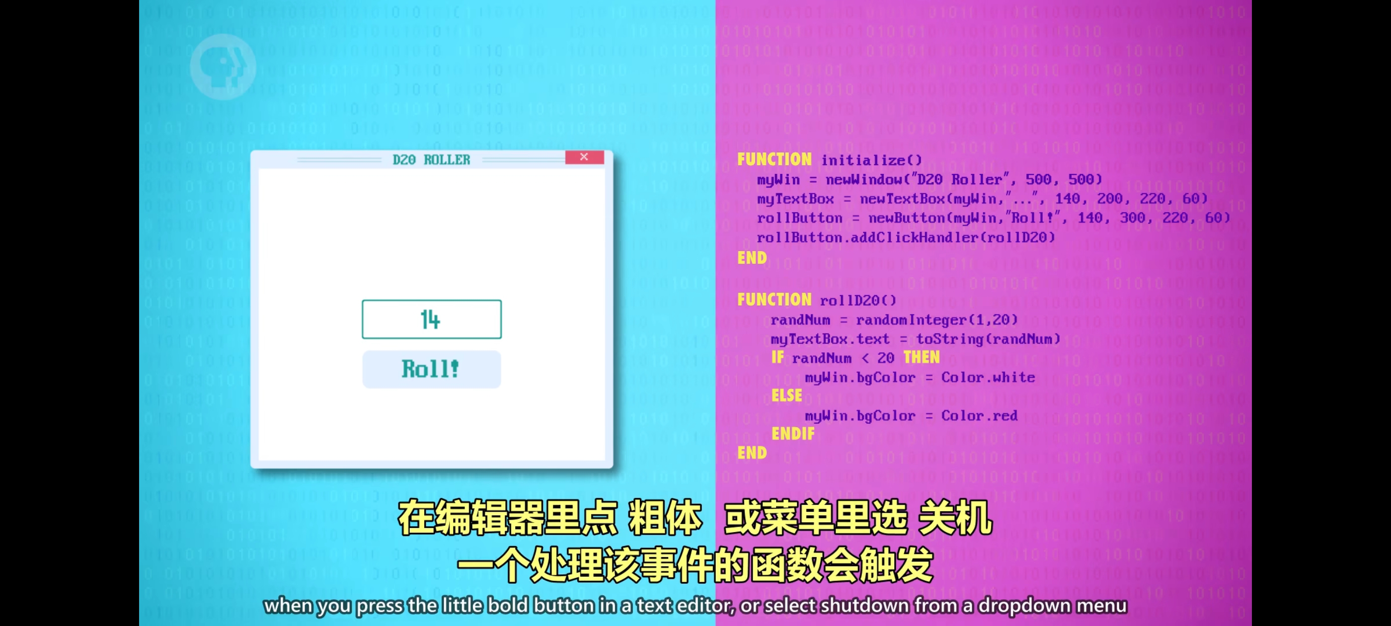 试着写一个简单例子,首先,我们必须告诉操作系统为程序创建一个窗口,通过 GUI API 实现需要指定窗口的名字和大小,假设是 500×500 像素,现在再加一些小组件,一个文本框和一个按钮。创建它们需要一些参数,首先要指定出现在哪个窗口因为程序可以有多个窗口,还要指定默认文字窗口中的 X,Y 位置以及宽度和高度。现在我们有个看起来像 GUI 程序的东西但如果点 Roll 按钮,什么也不会发生,在之前的例子中,代码是从上到下执行的,但 GUI 是 “事件驱动编程“,代码可以在任意时间执行以响应事件。这里是用户触发事件 比如点击按钮,选一个菜单项,或滚动窗口。假设当用户点 Roll 按钮,产生1到20之间的随机数,然后在文本框中,显示这个数字,我们可以写一个函数来做到这些,最后,把代码与”事件”相连每次点按钮时都触发代码。