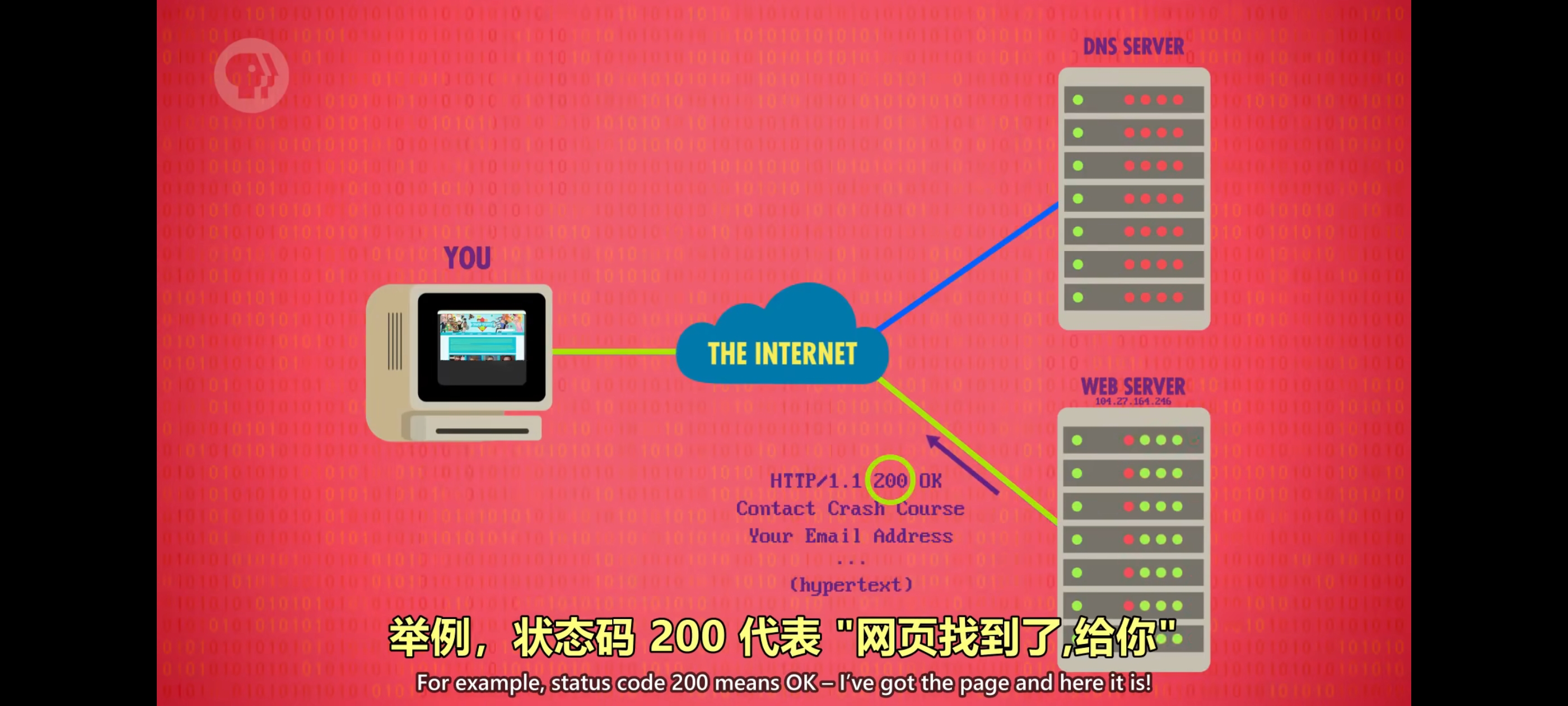 当你访问一个网站时计算机首先会做”DNS查找”,DNS 会输出对应的IP地址,有了IP地址浏览器会发送 TCP 请求连接到这个 IP 地址,这个地址运行着”网页服务器”。网页服务器的标准端口是 80 端口,你的计算机连到了 thecrashcourse.com 的服务器,下一步是向服务器请求”courses”这个页面,这里会用”超文本传输协议“(HTTP)。HTTP的第一个标准,HTTP 0.9,创建于1991年,只有一个指令,”GET” 指令。我们向服务器发送指令:”GET /courses”,该指令以”ASCII编码”发送到服务器,服务器会返回该地址对应的网页,然后浏览器会渲染到屏幕上。如果用户点了另一个链接,计算机会重新发一个GET请求,你浏览网站时,这个步骤会不断重复。在之后的版本,HTTP添加了状态码,状态码放在请求前面。