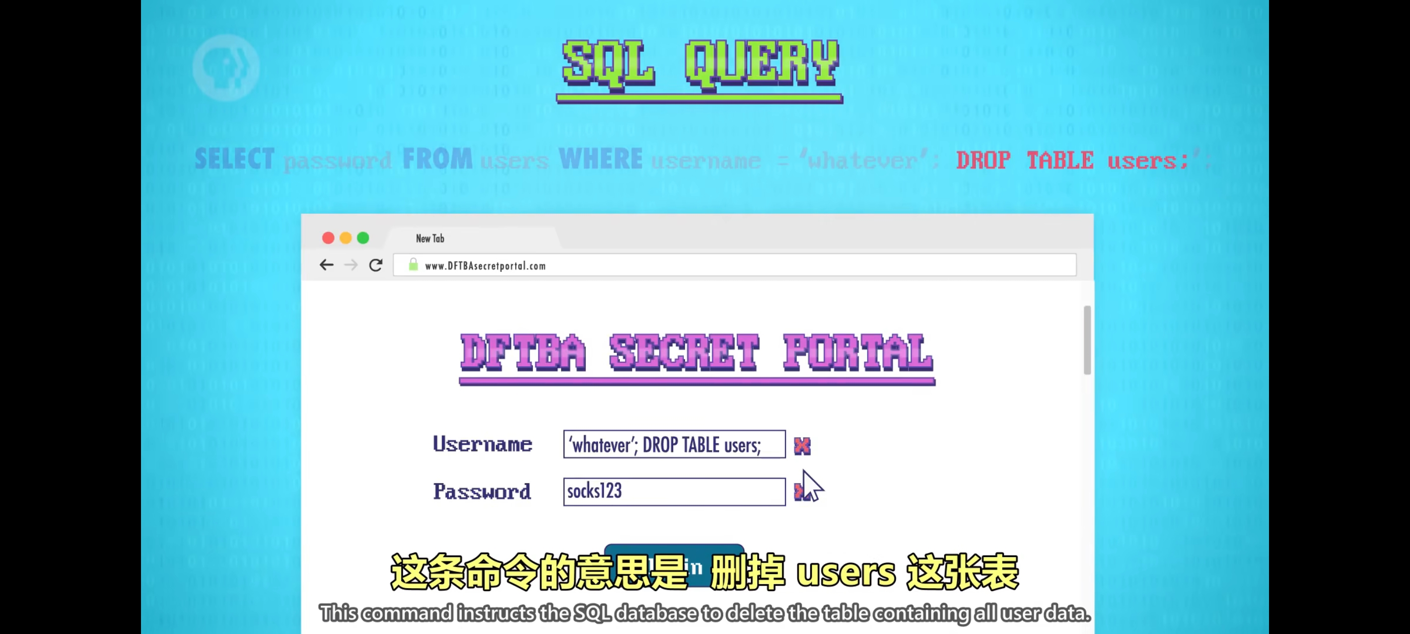 首先,语句要指定从数据库里查什么数据,还要指定从哪张表查数据,假设所有用户数据都存在 “users” 表里,最后,服务器不想每次取出一个巨大密码列表,包含所有用户密码,所以用 username = ‘用户名’代表只要这个用户。用户输的值会复制到”SQL查询”,实际发到 SQL 数据库的命令是where username=’philbin’,SQL命令以分号结尾。注入命令 drop table users ,删掉 users 这张表,我们甚至不需要侵入系统,没有正式访问权限,还是可以利用 bug 来制造混乱。