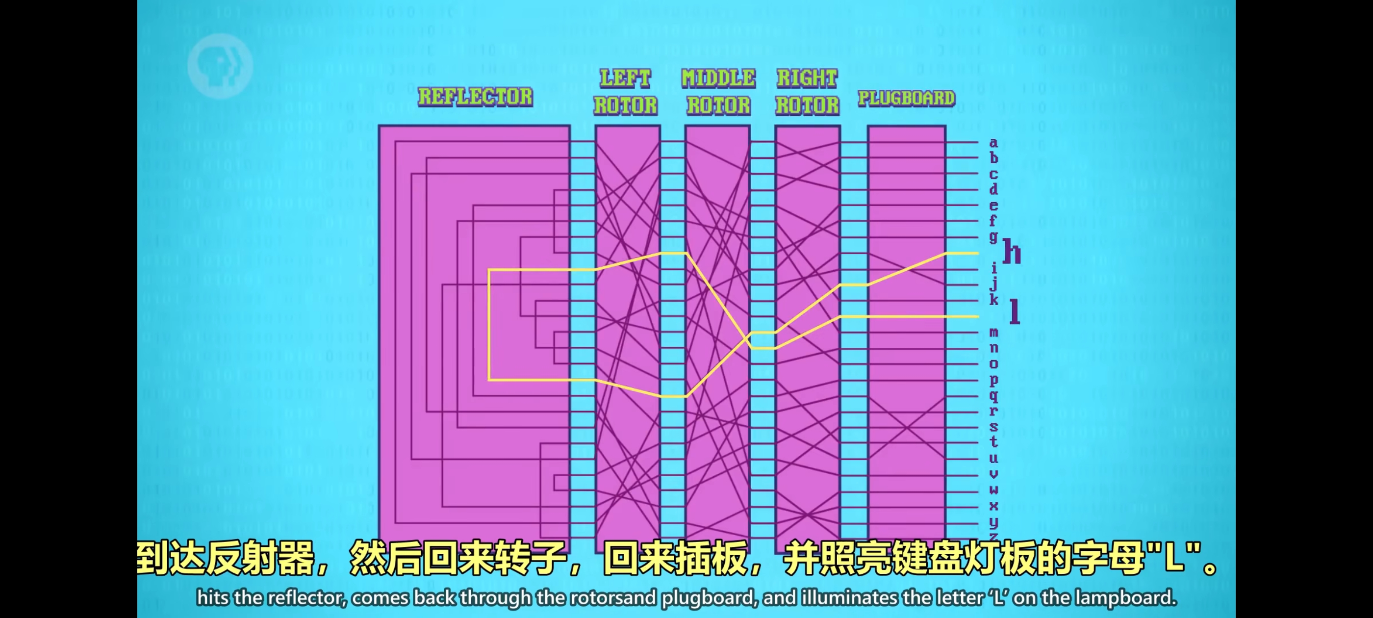 到了1900年代,人们用密码学做了加密机器,其中最有名的是德国的英格玛(Enigma),纳粹在战时用英格玛加密通讯信息,一台像打字机的机器,有键盘和灯板,两者都有完整的字母表,而且它有一系列”转子“(rotros) ,是加密的关键。可以按不同顺序放入转子,提供更多字母替换映射,转子之后是一个叫”反射器“的特殊电路,它每个引脚会连到另一个引脚并把信号发回给转子,机器前方有一个插板可以把输入键盘的字母预先进行替换,又加了一层复杂度。