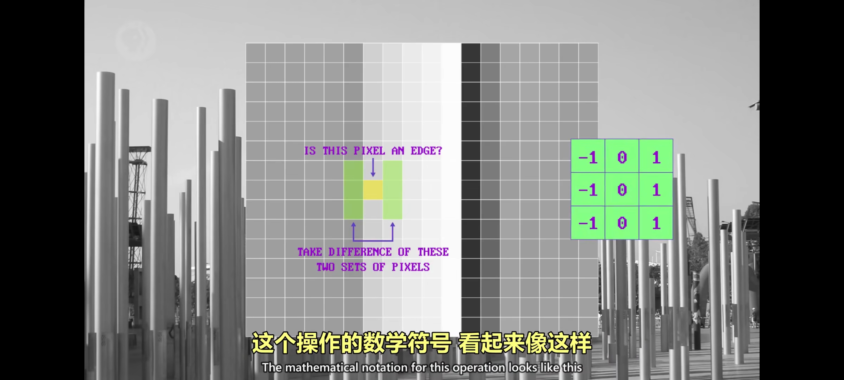 为了简单,我们把图片转成灰度,放大其中一个杆子,看看边缘是怎样的。因为有垂直的颜色变化,我们可以说某像素是垂直边缘的可能性取决于左右两边像素的颜色差异程度,左右像素的区别越大,这个像素越可能是边缘。这个操作的数学符号看起来像这样