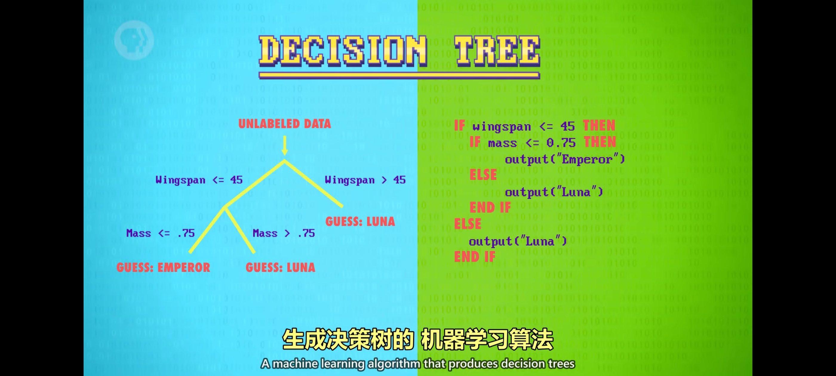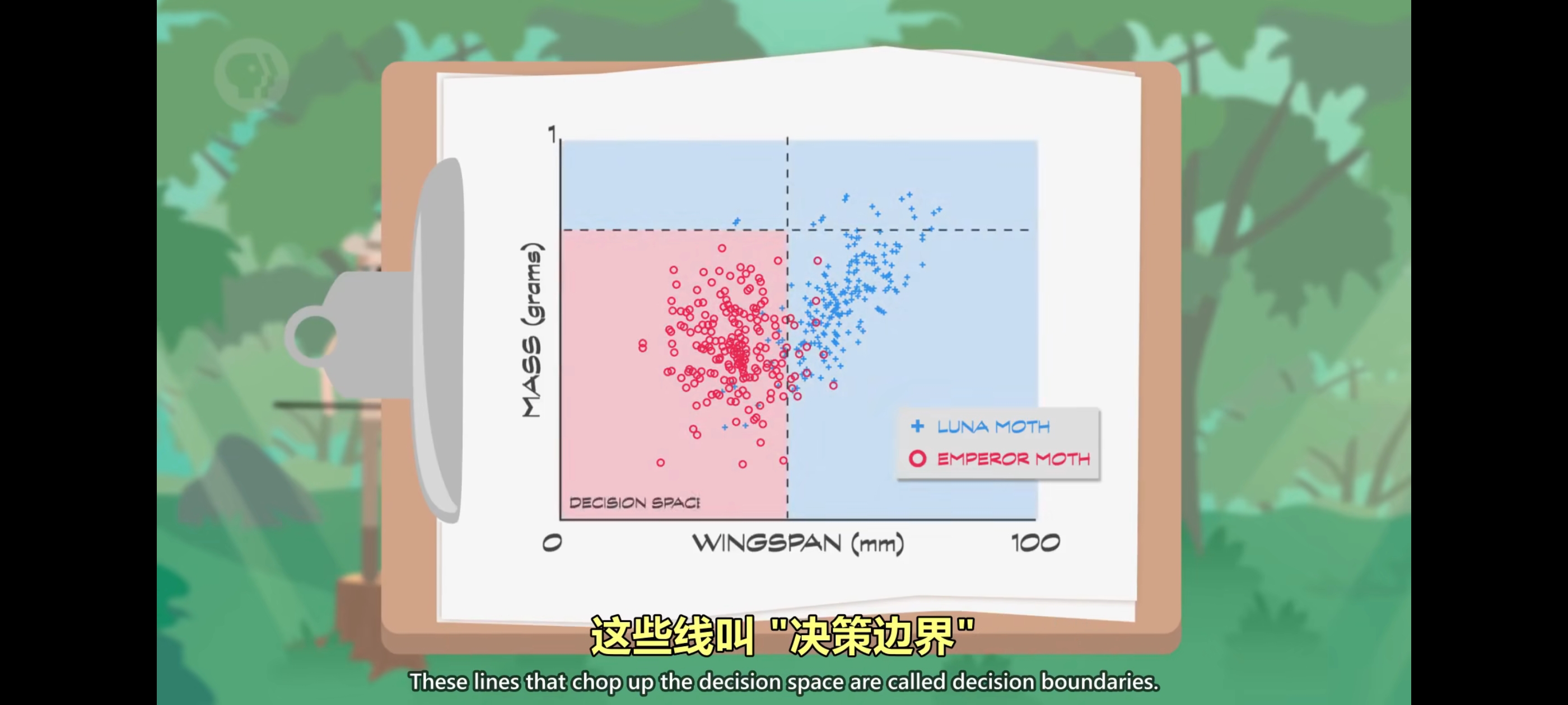 机器学习算法的目的是最大化正确分类 + 最小化错误分类,如果我们进入森林,碰到一只不认识的飞蛾,我们可以测量它的特征, 并绘制到决策空间上这叫 “未标签数据”。决策边界可以猜测飞蛾种类,这里我们预测是”月蛾”,这个把决策空间 切成几个盒子的简单方法,可以用”决策树“来表示,生成决策树的机器学习算法,需要选择用什么特征来分类,”决策树”只是机器学习的一个简单例子。