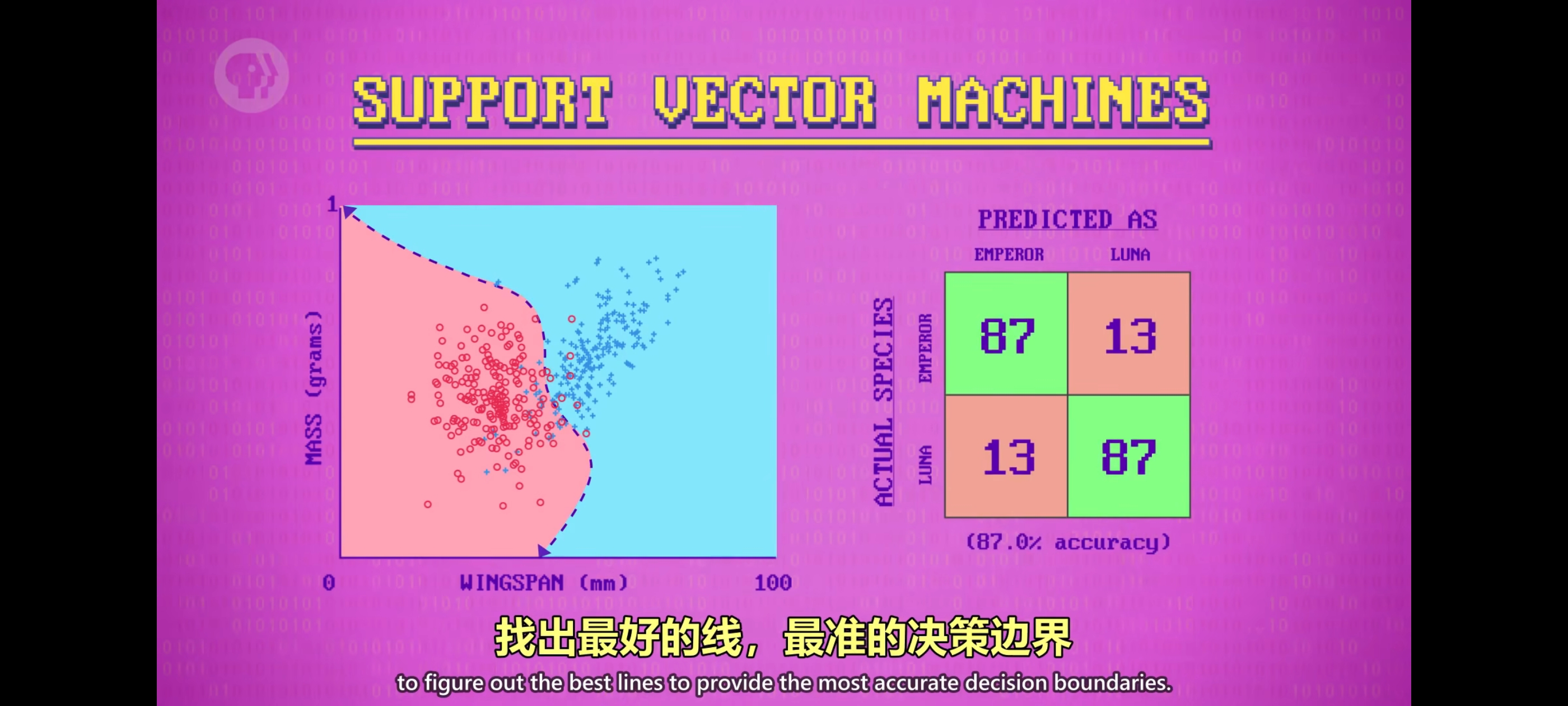 有一大类机器学习算法用了统计学,但也有不用统计学的算法,其中最值得注意的是人工神经网络。回到飞蛾例子,看如何用神经网络分类,同样,这次也用重量和翼展,第一层输入层,另一边是输出层,有两个神经元:一个是帝蛾,一个是月蛾,中间有一个隐藏层负责把输入变成输出,负责干分类这个重活。神经元做的第一件事是把每个输入乘以一个权重,然后它会相加输入,对这个结果,用一个偏差值处理,做神经网络时,这些偏差和权重,一开始会设置成随机值,然后算法会调整这些值来训练神经网络,使用”标记数据”来训练和测试逐渐提高准确性。最后,神经元有激活函数,它也叫传递函数,会应用于输出,对结果执行最后一次数学修改,例如,把值限制在-1和+1之间或把负数改成0。这只是一个神经元,但加权,求和,偏置,激活函数会应用于一层里的每个神经元并向前传播,一次一层,隐藏层不是只能有一层,可以有很多层,”深度学习“因此得名。训练更复杂的网络 需要更多的计算量和数据,尽管神经网络50多年前就发明了,深层神经网络直到最近才成为可能,感谢强大的处理器和超快的GPU。