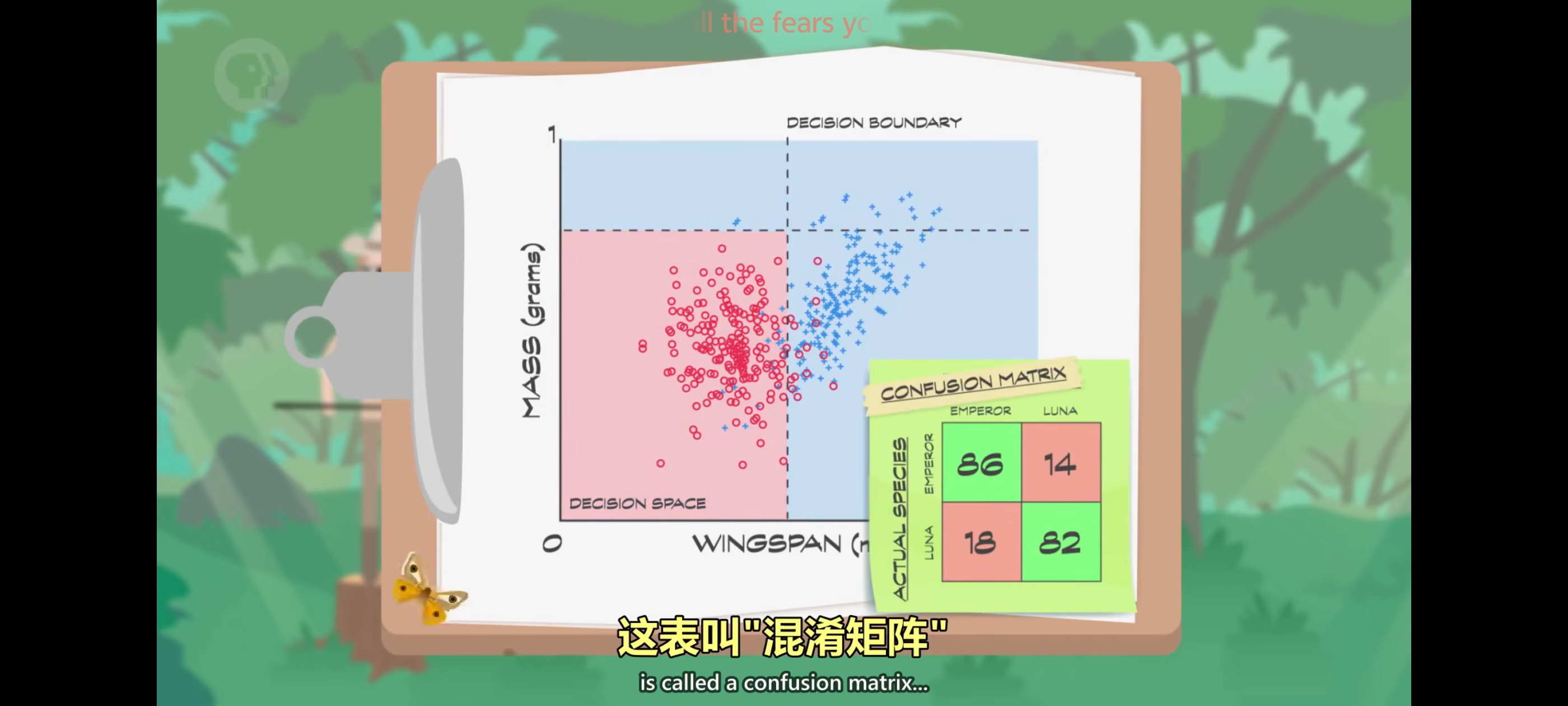 如果仔细看数据86只帝蛾在正确的区域但剩下14只在错误的区域,另一方面,82只月蛾在正确的区域,18个在错误的区域,这里有个表 记录正确数和错误数,这表叫”混淆矩阵“。